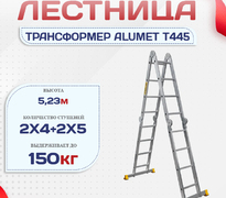 Шарнирные лестницы-стремянки серии Т4 Алюмет – это универсальные стремянки, состоящие из 4 секций по 3 и более ступеней для выполнения сложных задач. Лестница может иметь комбинированную конструкцию для определенной высоты и вида работ, быть преобразована в обычную двухстороннюю стремянку, приставную лестницу, подмости, а также в Г-образную лестницу для специфического рельефа.