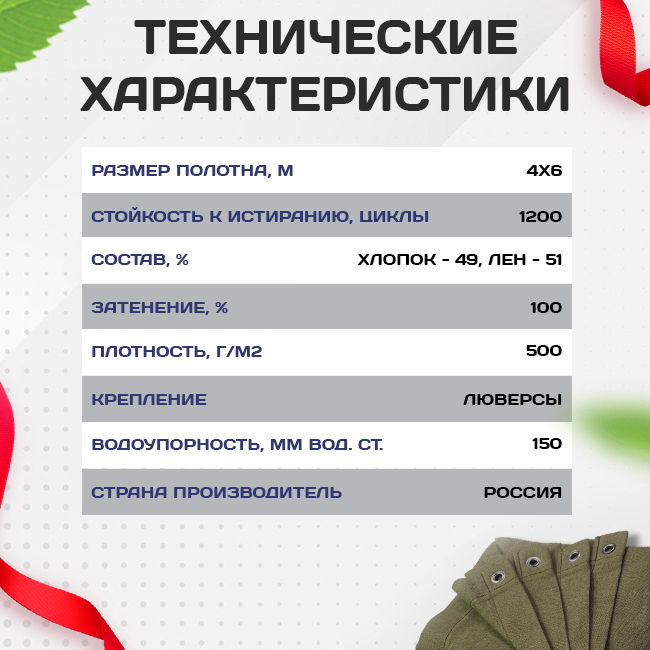 Брезент натуральный «дышащий» материал, состоящий из льна и хлопка. Люверсы по периметру каждые 0,5 метра. Брезентовые полога (тенты) применяются в тех случаях, когда необходимо защитить достаточно обширные поверхности от внешних воздействий. Обычно эта защита заключается в предупреждении запыления, замерзания и намокания укрываемых объектов. Также брезентовые укрытия применяются для защиты перевозимых грузов от грязи, влаги, механических повреждений и потерь при транспортировке.